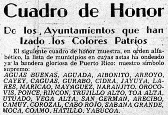 On May 4, several hundred people, including intellectuals and representatives from civil, social, and cultural groups, held an assembly in the Ateneo Puertorriqueño and formed the Frente Unido por la Constitución de la República. This broad front regularly engaged leaders from all of Puerto Rico’s political parties in addition to other groups and organizations. Their first major public event took place May 10 in Caguas and had about 10,000 people in attendance with some 350,000 more estimated as listening to its radio broadcast. The newspaper El Imparcial regularly published an “honor roll” of municipalities where the U.S. flag was lowered, and the Puerto Rican flag raised in City Hall in support of the constitutional convention movement. By May 12, El Imparcial listed thirty municipalities. More towns eventually joined.